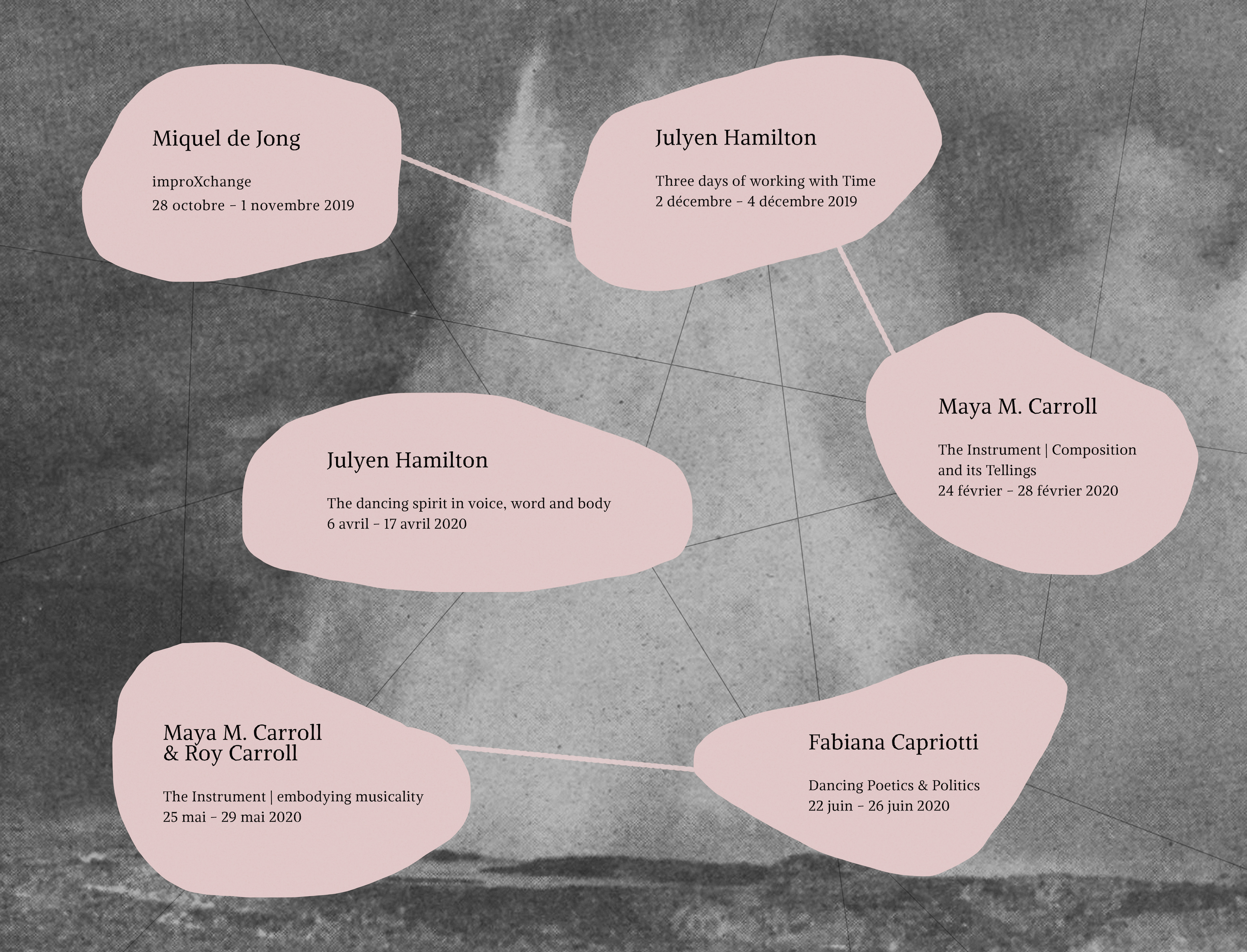 Dancers / teachers with whom I studied that influenced my dance in different ways: Julyen Hamilton, Lisa Nelson, Meg Stuart, Joao Fiadeiro, David Zambrano, Katie Duck, Shelley Center, Wally Cardona, Donna Uchisono, Rebecca Hilton , Bárbara Mahler, Kirstie Simpson, Marina Giancaspro, Teresa Duggan, Martha Lozano, Patricia Padula and Nora Padula among others.
