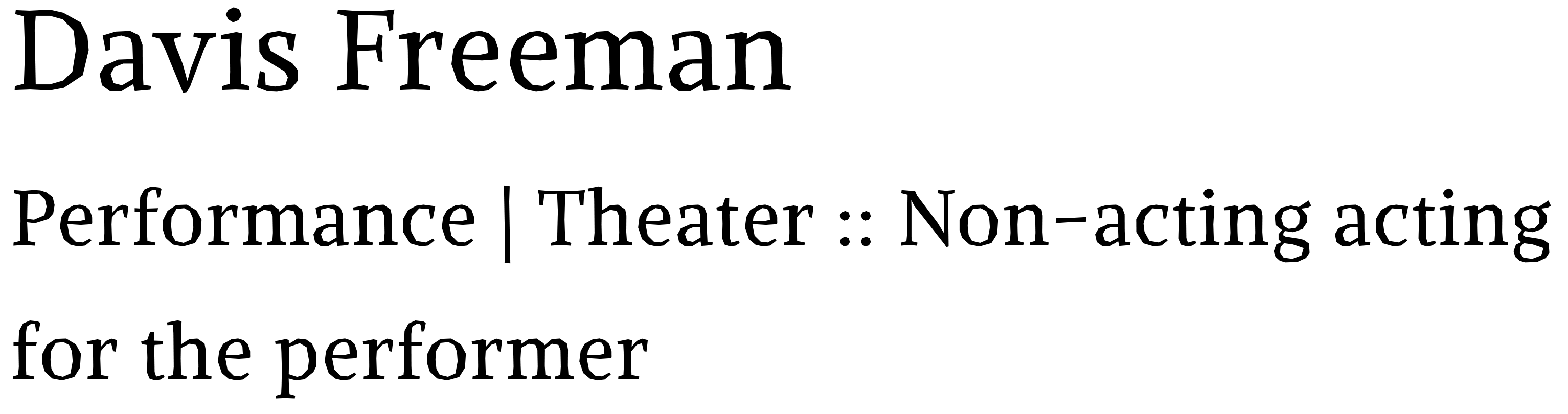 Davis Freeman (1969) est un artiste américain qui a travaillé avec Forced Entertainment (Bloody Mess, The World in Pictures), Meg Stuart (Built to Last, Highway 101, Alibi), Stephan Pucher (Kirschgarten, Snapshots) et Superamas (Big 2, Big 3, Empire). En parallèle, il a créé sa propre compagnie Random Scream en 1999 à Bruxelles. Son travail est éclectique : il fait du théâtre contemporain, de la danse, des installations photo/vidéos et des projets curatoriaux. Entre performance de type documentaire et « théâtre de sournoiserie politique », ses pièces « militent » souvent pour un monde plus écologique. Il est actuellement en tournée avec ses dernières pièces Now & the future, A better place et 7 promises.